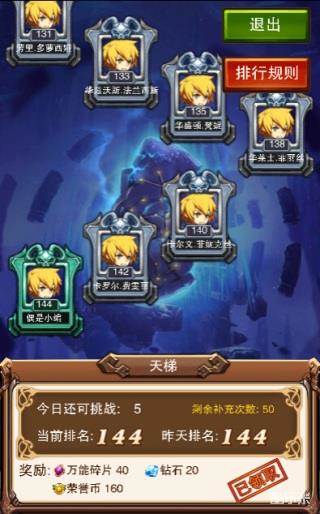 天梯排行是每天都进行结算的,排行越高奖励越多:万能碎片、钻石、荣誉币统统都有。同时每周前三名玩家将获得勇者称号,称号会给予勇者一定属性的加成,在聊天框里有着特别彰显实力的装饰。