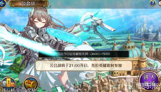 为了公会,拿起你手中的武器战斗吧!需要注意的是参加公会战是有要求的,需要贡献值达到1500而且公会战并不是全天开放,每天下午21:00准时开放,可以获得排名奖励,奖品异常丰厚