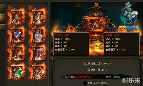 神武装备等阶和转生等级息息相关,神武等级不可高于转生等级。因此,在ppwan《花千骨》中要想升阶神武,首先要提升转生等级,玩家可通过消耗修为和往生莲转生。将转生等级提升后玩家就可通过神铸提升神武等阶了,不过在这之前不要忘记收集到足够的究极神铁哦!