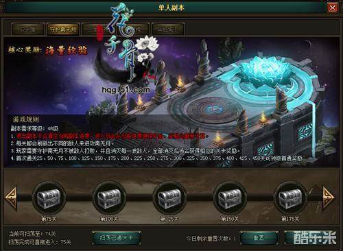 51《花千骨》守护南无月是单人副本之一,玩家达到40级后通过“副本大厅”进入副本。倒计时结束后,将有大批怪物前来诛杀南无月,玩家要做的就是保护南无月不被破坏,否则的话就守护失败。虽然失败和胜利都会获得奖励,获得奖励的多少是根据击败的敌人数量来决定,但此玩法的设置,目的在于守护南无月,杀怪获经验都是辅助,因此在保证南无月安然无恙的情况下杀怪,才是该副本的守护意义。