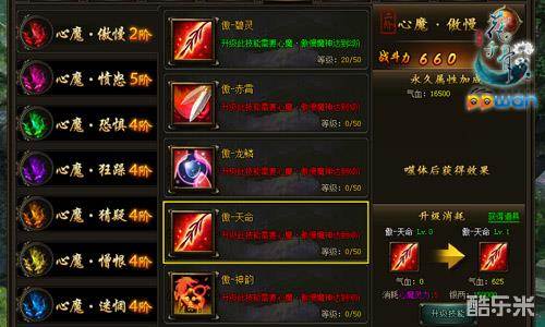 心魔神诀通俗来说就是心魔技能,定向永久提升玩家的某种属性。在ppwan《花千骨》中,七大心魔都有着自身独有的五大心魔神诀,其中有三大技能为提升防御力、攻击力、生命,另外两大技能主要提升特定属性。例如心魔·傲慢,天命技能提升生命,而神韵增加心魔噬体后生命点数。随着心魔阶数达到2、4、6、8、9阶,这五大技能将一一开启,为玩家战斗更添激情!