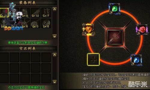 上仙打开锻造炼炉,选择“宝石镶嵌”后,会看到左边的装备列表和宝石列表,每件装备都能镶嵌五颗非同属性的宝石,试想1级攻击宝石增加50点攻击,全套装备总共可达五十颗,累计提升的属性可想而知!而宝石的镶嵌很简单,选择镶嵌装备,点击右侧装备上的宝石孔,然后双击宝石列表要镶嵌的宝石就可以了,宝石随时免费摘除,选择宝石,“摘除”即可。