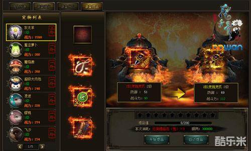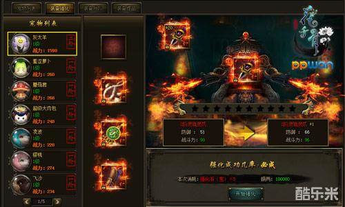ppwan《花千骨》宠物界面除了宠物列表页,分别增加装备强化页、装备升阶页、装备提品页,具体打造如下: