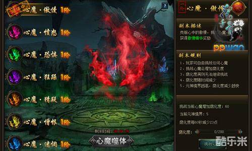 ppwan《花千骨》新副本挑战心魔不止是单纯的精华产出地,也不是单一的刷本刷资源,副本的设定还是充满着乐趣与挑战,玩家需要不断的突破再突破。玩家可以选择任意心魔副本进入挑战,但是随着挑战会带来腐化度,只有随着时间才能减少,当腐化度满值则无法继续挑战。这就需要首先聚集元神的提升突破,因为元神境界越高,腐化度会飞快的减少!