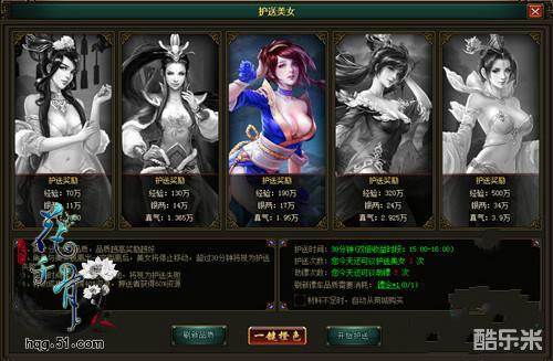 美女护送成功后,玩家可以获得海量的经验、银两和真气奖励,想要获得更多的奖励就需要护送更高品质的美女了。护送的美女默认都是最低品质的,玩家可以消耗押镖令刷新品质,押镖令则可以通过商城购买、活动奖励及野外BOSS掉落获得。此外,玩家还可以消耗200元宝直接获得最高品质的美女,这样就能获得最多奖励了。
