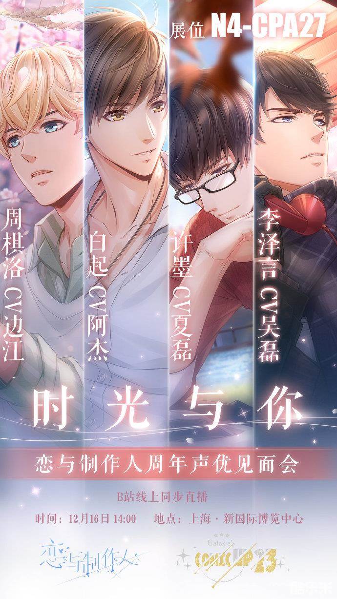 12月16日14:00,边江、吴磊、夏磊和阿杰四位声优老师齐聚CP23恋与制作人展台N4-CPA27,B站同步线上直播,与你一同回忆在恋语市度过的时光。
