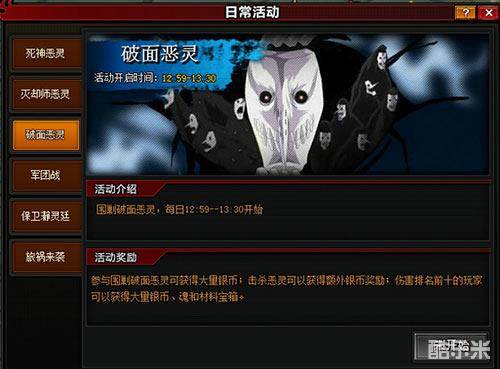 在死神中“蓝染”蓝大大虽然颜值很高评价也不错但是,但是我们作为大BOSS是必须消灭的。在1k2k《死神狂潮》中也是如此,但是一批破面恶灵是他的忠实追随者。所以围剿破面恶灵就是每天必须进行的活动,一点点的搬开这些绊脚石然后不断的前进,才有可能把他消灭。围剿恶灵可以获得大量的银币和经验,而且伤害高的有额外奖励,然后有了奖励就有增强实力的办法了。