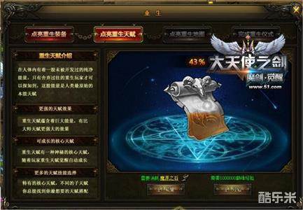 51《大天使之剑》新玩法的开启将迎来更多全新的挑战,二转401级以上的玩家,即可自动领取重生任务,重生任务分为四部分:点亮重生装备、点亮重生天赋、点亮重生地图以及完成重生仪式。玩家可通过击杀怪物获得魔源之石来为魔法阵注入能量,完成点亮任务。当任务全部完成之后,即可变成重生玩家。