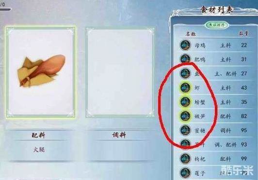 2、自创菜式需要靠自己搭配。每选择一样材料后,在右侧的食材列表中能够与该食材搭配的材料名字会有黄的光圈(如图):
