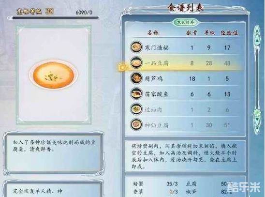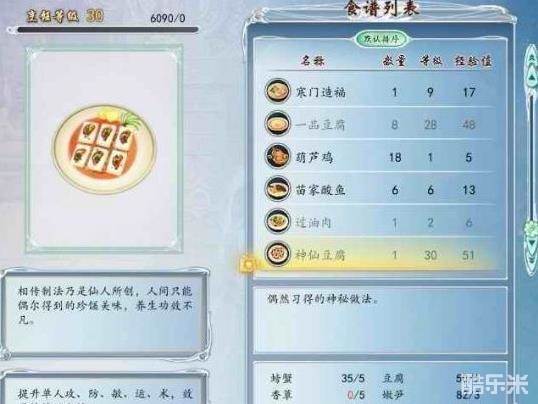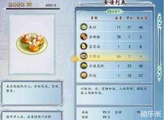 4、很多菜式都有烹饪等级限制,我个人研究的比较快捷提升烹饪等级的菜式是自创的“巨胜奴”,材料可以直接在家园里的龙人商店买,而且价格便宜,一次做多能制作33个(大概200经验左右)