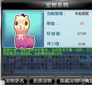 细心的羊驼妮妮时刻守护着您,当您在比赛中落后于第一名时,它将为你提供额外的落后补偿加成。最高等级可加成150%。