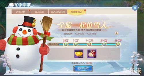 当本服务器的全体玩家收集的“雪人之心”道具达到指定目标时,位于龙城地图的“雪人”将逐步堆积变大,最终成为一只霸屏的超大型完美雪人。与此同时,全服玩家都能拿到指定档次的福利道具——1500元宝、5张F4宠物卡、20个宠物能量棒等大量道具唾手可得,轻轻松松赚得钵满盆满。