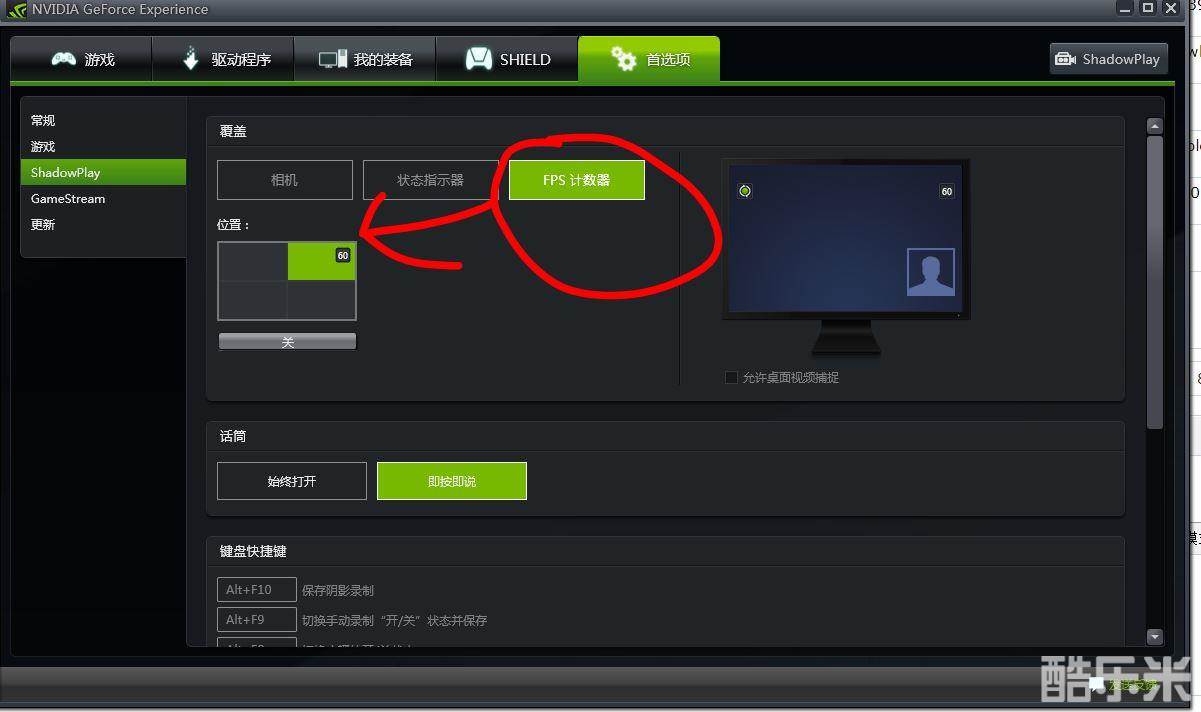 然后在首选项里选择shadowplay,然后点显示帧数。