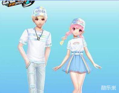 白色T恤上印着蓝色荧光条纹,搭配浅灰的牛仔裤和白色运动鞋,衬托出男生的活力与青春。女生身着白色T恤与蓝色收腰伞裙,T恤上的彩虹条装饰与伞裙的彩虹缀带相衬,突显活泼和阳光。
