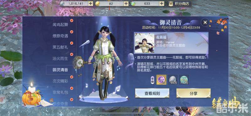 随着《花鼓摇》的发布,《镇魔曲》内“御灵清音”活动也同步开启。天命者们在活动页面便能欣赏到这首优美欢快的角色单曲,也能参与到这次活动中、将这首古风盎然的新歌分享出去,让更多人享受到美妙的音乐!