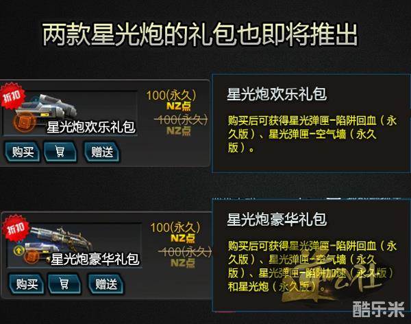 并且同时还会推出两款星光炮的礼包(分别为欢乐礼包与豪华礼包),而两款礼包的区别在于欢乐礼包只含有新推出的两款功能性弹匣,豪华礼包不仅含有三款功能性弹匣还拥有一把永久版的星光炮。这对于脸黑党们来说是一件好事,毕竟在正服中即使星光炮爆率再高也不是人人都有的,对于那些没有星光炮的玩家在此次更想后依然有机会去体验新款弹匣的威能。