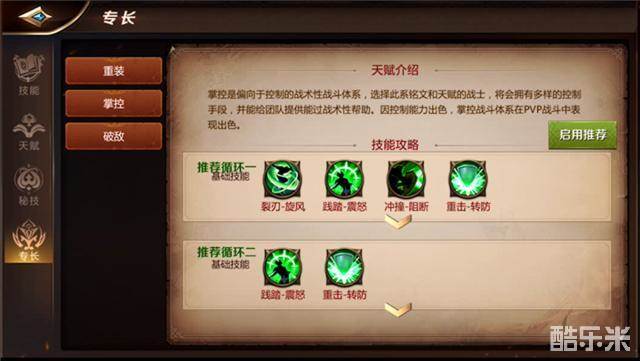 而专长方面,推荐使用强化控制的掌控。战士的三组专长分别为重装、掌控和破敌。掌控比较偏向于控制,战术性非常强,可以很好的帮助队友创造输出环境。剩下的两套专长,重装强调防御、破敌强调输出都有点剑走偏锋的意思,没有掌控这样全面。