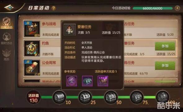 分为2轮,1轮10次任务,获得经验,银币,声望,完成每轮任务有概率获得金币等各种奖励,声望主要用于在声望商店购买随从,要塞任务需要随从完成。