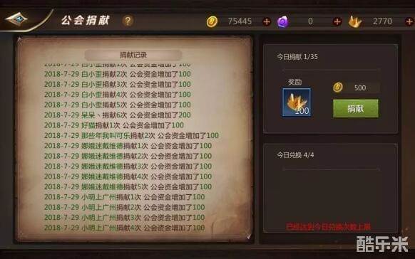 每日捐献帮贡有四次机会开启工会宝箱,有很大概率直接获得金币奖励。