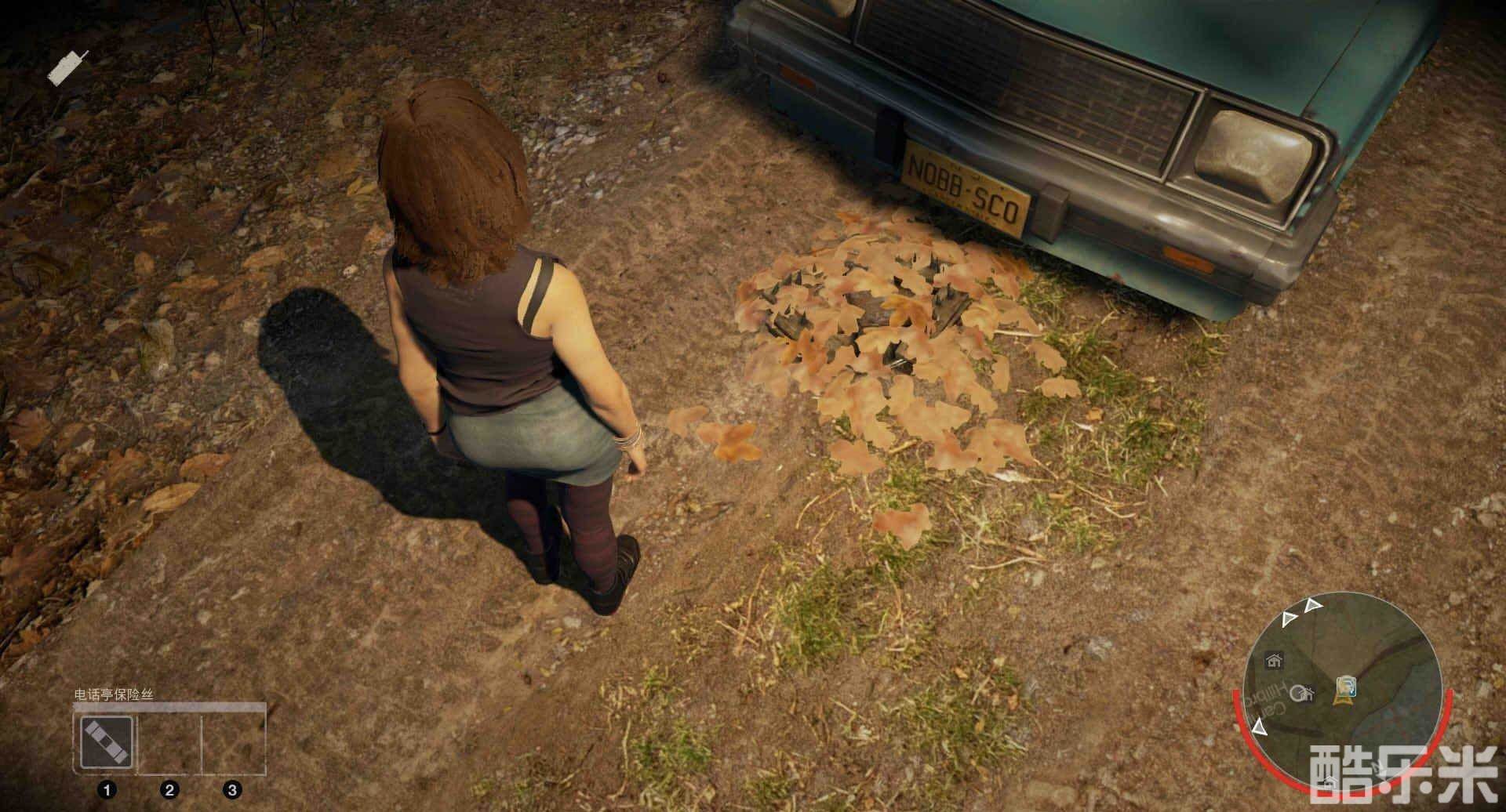 另外请在修车前或上车时注意脚下,小心陷阱。图中诡异的落叶就是陷阱,不注意的话不是很显眼。另外只有砍刀才可拆除陷阱(拆除后砍刀损坏),不然只能人体排除(车油箱位置放陷阱,陷阱位置不好的话可能直接加油踩不到,但是车头这边位置直接修车基本必中陷阱)。