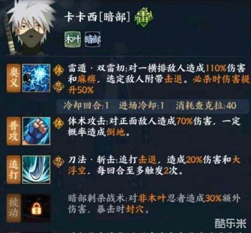 火影忍者ol手游中有很多小伙伴们都不知道暗部卡卡西技能怎么样,那么下面就由小编来为大家带来暗部卡卡西技能介绍吧,希望能够帮助到大家。