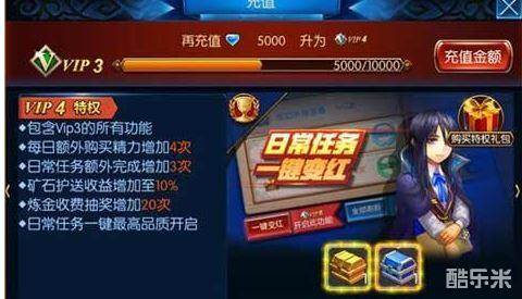 无需购买,只要充值便会累积vip经验条,当vip条满时便可升级到下一级vip。每级vip都有多种多样炫酷实用的特权,可以购买限量的特权礼包(包含高级血瓶、紫色装备、独占时装、独占头衔等绝版道具),还会收到额外的赠品。