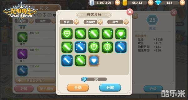 此外,若是有多余不用的符文,可使用符文分解功能。通过符文分解有机会获得符文精华和万向石。而万向石可以用来改变符文的能量连线方向。