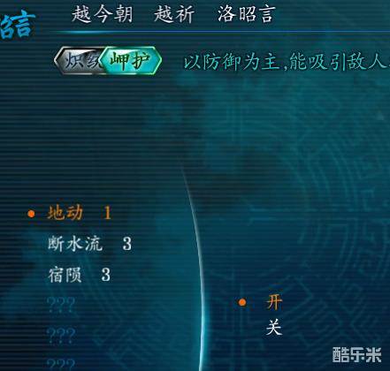 举个例子:当你将越、洛的天赋在队列中调整为飓影、岬护,并在技能页面将该天赋其他俩个技能关闭(就是 只打开气灸术与断水流)时,你控制越祈,那么越、洛在战斗中就只会使用这两个技能,一个变成 了奶、一个变成了T,嗯就是这样