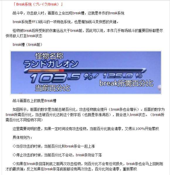所谓的破防系统在最终幻想13里是break系统,这点可以说是照搬了,仙六没玩到需要这个系统的地方,不知道是有所改进或者因为设定原因导致战斗不流畅。最终幻想13的break条是由魔法攻击积攒的,break之后的攻击是呈倍数增长,所以战斗中配合阵形魔法集火增加break值,break之后变换攻击阵形集火输出是基本套路,不知道仙六是怎么个机制。