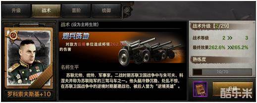 在《装甲使命》中每个传奇将领都有自己独有的战术。罗科索夫斯基的战术为炮兵阵地,它能对敌方后排单位造成将领n%(n代表是随着战术提高数值越大)的伤害。它是被动技能,触发需要战斗时将领的战术能量值满槽后,自动发动,升级需要不同数量的战斗手册进行升级。