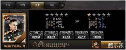 每个将领都可以晋阶到5星将领,升阶需要消耗该将领不同数量的委任状。每晋阶一级都可以解锁一个将领特长效果,每个将领的特长效果是不同的,罗科索夫斯基的5大特长效果如图: