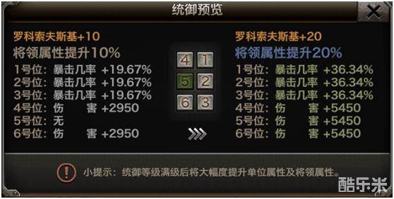 每个将领统御最高达到20级,提升统帅等级将影响更多阵位及阵位上单位属性加成,并增加将领全属性。统帅升级需要消耗统御手札。罗科索夫斯基最终能达到的属性如图:
