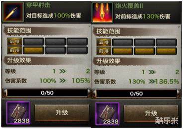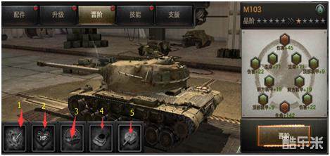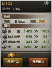 每款坦克的升级都是跟随指挥官等级升级而升级,每升一级都有不同层度大幅度的属性加成,升级所需消耗金币。M103升级重点在伤害,可以看升级数据,计算能得到升级幅度的排序:生命> 伤害> 前方装甲>顶部装甲