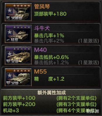 每款坦克的支援都有4个支援单元,支援的坦克也不同,所加成的属性一不同,随着拥有的支援单位的数量不同也有不同的额外属性加成,M103支援的坦克及其属性的加成如图。