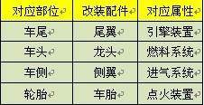赛车外形改装配件,分别可以对赛车的哪些部位进行改装,并分别对应赛车的哪些属性?