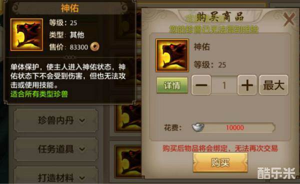 单体保护类:肉墙,神佑。肉墙技能可以使主人进入保护状态,珍兽为主人承受一定伤害。神佑,使主人进入神佑状态,神佑状态下不会受到伤害,但也无法攻击或使用技能,但是可以移动,是一个无敌状态技能。