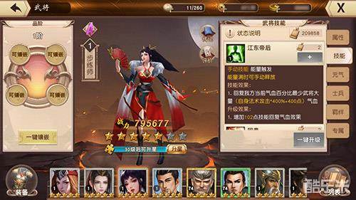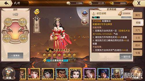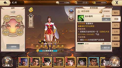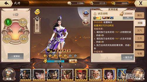 带有超强的辅助能力,全面强化我方武将物防法防,免疫眩晕的强力推手效果。