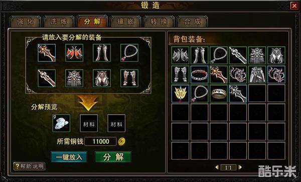 通过锻造功能—分解可以将这些装备分成为洗练石,拿来增加装备的附加属性。一键分解不会自动放入紫色装备和有强化等级的装备。只有绿色以上品质的装备才可以被分解。分解装备需要消耗一定数量的铜币。