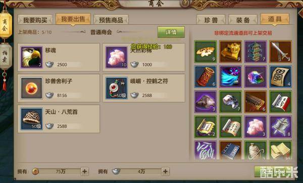 除了购买外,还可以出售自己不绑定的珍兽,装备,道具。
