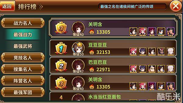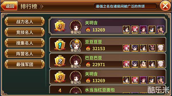 竞技名人当然就是指在武斗场内的较量啦,根据武斗场获得的威望总数,会对各位穿越者进行排名;搜集名人分为关卡名人和卡片名人。关卡名人的排名是根据各位穿越者在通过关卡时获得的星星总数,卡片名人的排名是根据卡片累计获得的总分数决定的。阵营名人是指义勇军和山寨军阵容中,累计战功的佼佼者。最强军团上榜的方式就很多样化了,根据团体总战斗力,军团夺宝活动,以及各个城池中的军团声望,都会做出相应的排名的。