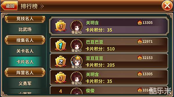 在排行榜界面中,我们会发现有各种各样的榜单。毕竟,三百六十行,行行出状元。走上榜的路绝对不止一条。打个比方来说,即使你的战斗力并不是那么出众,但是你可以通过搜集卡片成为一名卡牌达人。点击想要查看的榜单即可查看对应的榜单