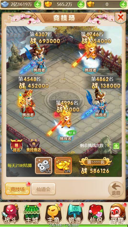 4.竞技场会根据玩家在每天21时的排名进行发放排名奖励,排名越高奖励越丰富。