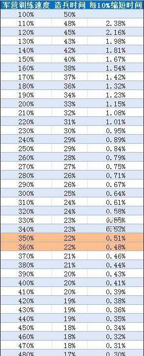 可以看到在训练速度达到355%以后,每提升20%训练速度(一个25庄园),才可获得实际收益1%。
