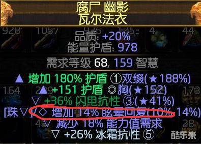 我们来看这件装备,首先解析一下词缀 (能量护盾以下简称ES)前缀包括了一个百分比ES单缀,一个百分比ES复合词缀(两个共同构成了158%ES),一个数值ES词缀(72ES)。一个眩晕格挡回复复合词缀,一个眩晕格挡回复单缀(两个共同构成了37%回复)及一个大师附魔的冰冷抗性。
