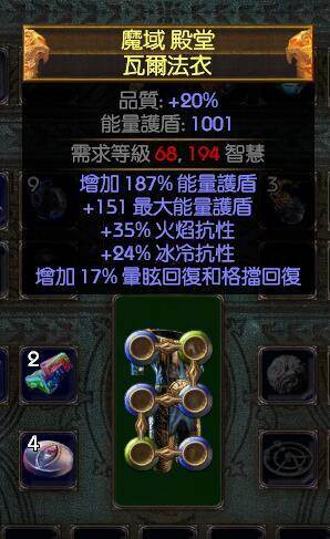 1.正确的底子装备:首先要制作装备要准备合适的底子,只有最顶级(种类上的)的装备初始属性才是最高的,通过百分比等加成的最终属性也将是最高的,比如同为ES底子的瓦尔法衣初始ES175,但是灭世法衣初始ES111。同时底子的物品等级(按ALT查看)物品等级通常需要超过84(可以洗出T1的属性)
