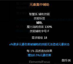 还是同样道理,上面所说的“元素集中”之所以能给正火进行加成,是因为它的“被辅助的技能无法造成元素负面状态”指的是“点燃、冰缓、冰冻、感电”,不是指燃烧。这里看英文原文的话比较好,“无法造成”这个词(cannot inflict)表示动作,而直接使周围敌人置于某种状态则没有动作。