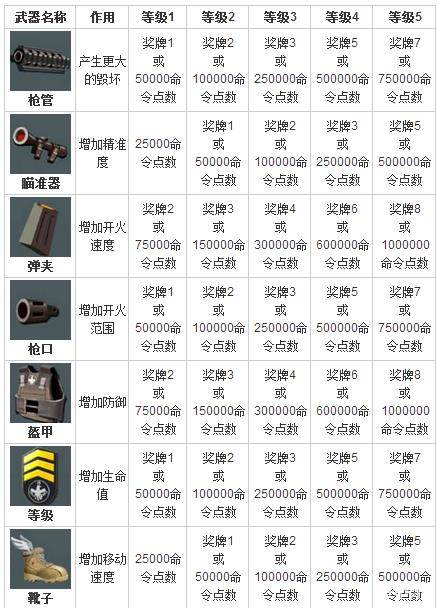 《小小部队2》游戏中士兵武器的配置影响着玩家在任务中的进度,每种武器都有5个等级,每个等级所需的奖牌和命令点数是不同,下面是士兵武器升级详细升级表: