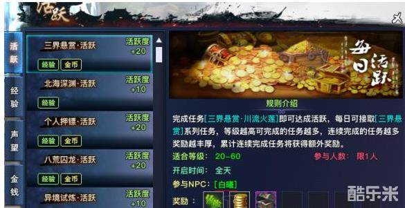 3、当完成活跃度任务后,不仅能获取活跃度,也可以获得丰厚的经验及道具奖励,当活跃度足够时,便可领取活跃度宝箱。