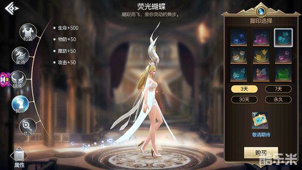脚印外观是展示在鞋子周围的特效,随着角色在场景中的移动,脚下始终跟随者一阵细细的流光,招蜂引蝶必备。