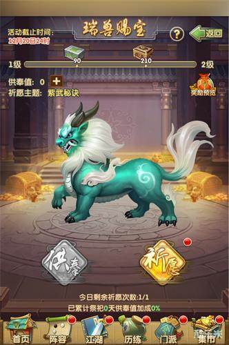 另外,貔貅供奉也将于本次版本更新后同步开启,每日0点更新重置。掌门进入貔貅祈福的系统后,初始状态下只有祈福这一功能,但当祈福次数用完之后,即可进行供奉,并升级貔貅。供奉可获得奖励以及貔貅升级所需的经验。每日掌门都可享有免费的供奉次数,累计供奉不同天数,获得的经验加成也有所不同。